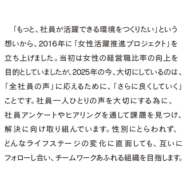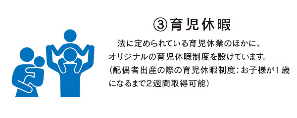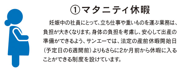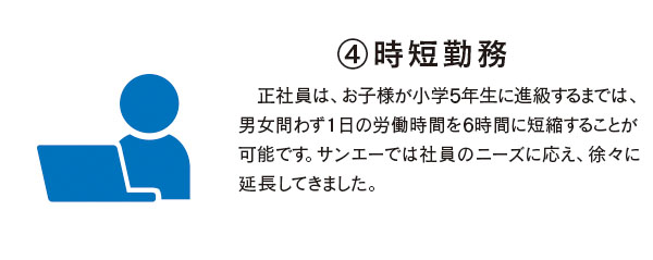社員が安心して働き活躍できる環境を目指して、国が定めている法律に加え、サンエーらしい制度づくりに取り組んでいます。小売業は「変化対応業」。これからも時代に合わせて変化に対応し、「幸せを共感する」企業を目指します。