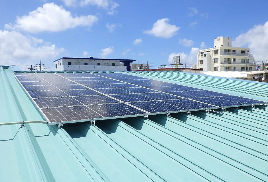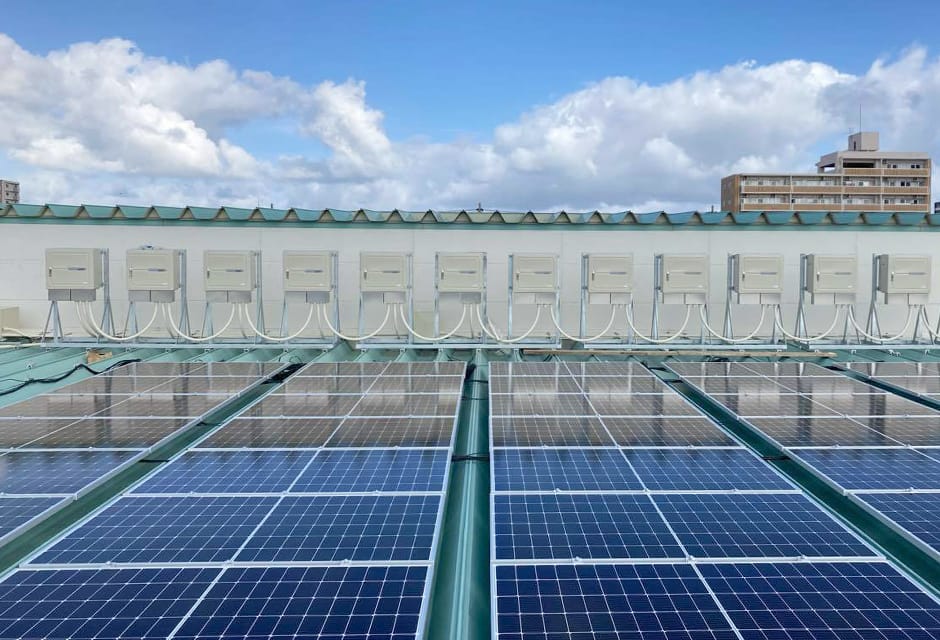 V21食品館牧港店は、太陽光発電設備の設置に合わせて、高効率空調設備の導入によりエネルギーを最小限に抑えつつ、再生可能エネルギーによる自給自足を行うことで、エネルギー効率を向上させました。