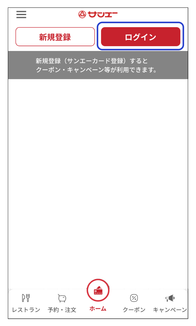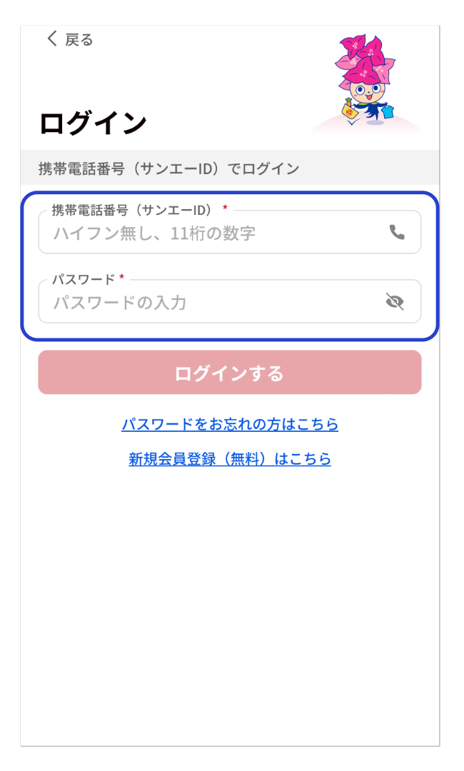 サンエーアプリ ログイン方法 ①「ログイン」を押す ②「携帯電話番号」・「パスワード」を入力 パスワードは半角・英数字(英字は大文字と小文字)8文字~20文字※ログイン画面の「パスワードをお忘れの方はこちら」より、パスワード再設定をお願いします ③「認証コードの入力」→「認証」で完了