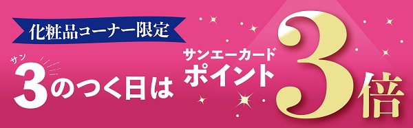 ※化粧品コーナーの3のつく日はポイント3倍は予告なく変更、終了する場合がございます。