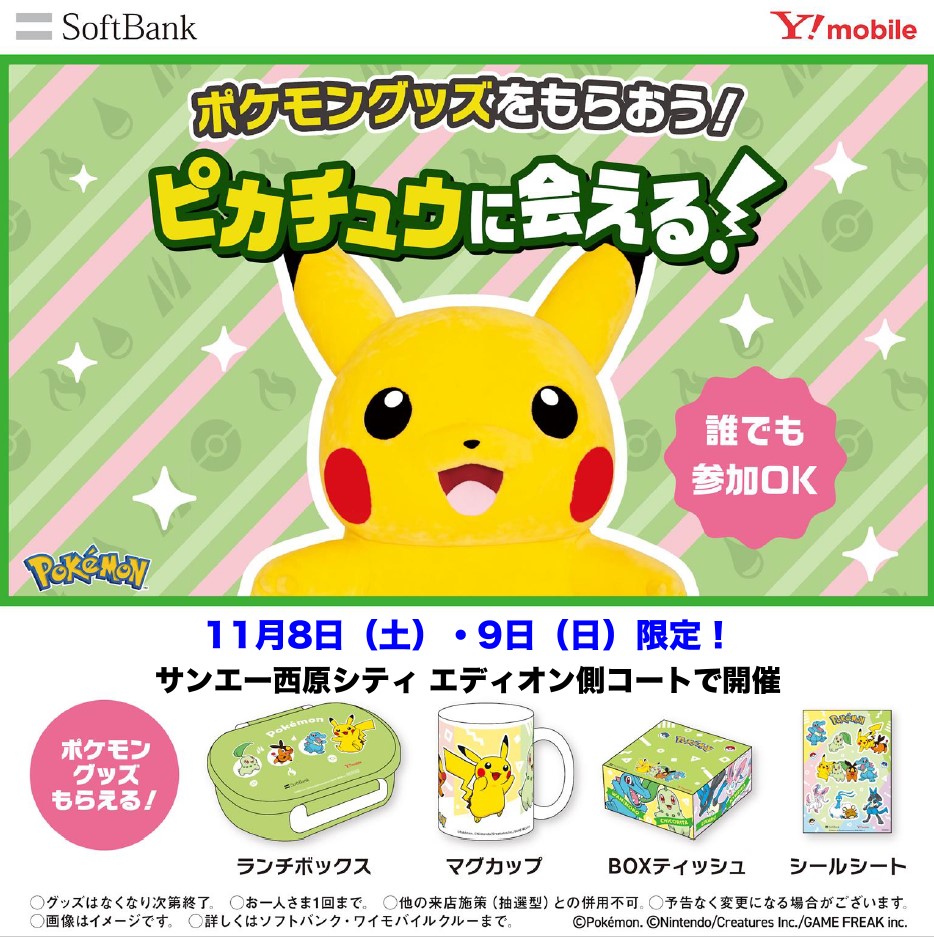 ポケモンイベント~ピカチュウ写真撮影会~ ポケモンイベント~ピカチュウ写真撮影会~日時:11/8(土)~9(日)時間:10:00~18:00 <ピカチュウ登場時間>11:30~12:0013:00~13:3015:00~15:3016:00~16:3017:30~18:00 写真撮影会参加方法:各回30分前より整列開始 先着40組限定(会場にて整列いただいた順番に整理券をお配りします) 場所:西原シティ(1Fエディオン側コート) 主催:エディオン(ソフトバンク)