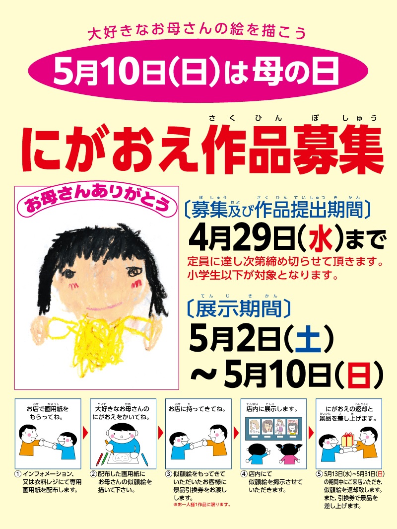 景品引換期間:5/13(水)~5/31(日)の期間中にご来店いただき、似顔絵を返却いたします。また、引換券で景品を差し上げます。