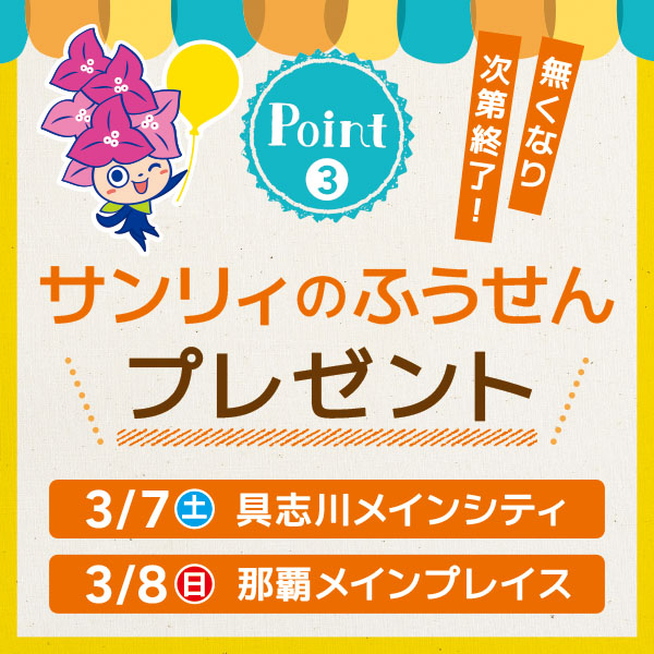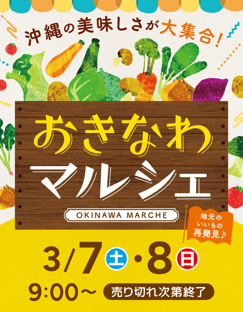 おきなわマルシェ 開催日時開催店舗3/7(土)・3/8(日) 9:00~売切れ次第終了具志川メインシティ (1Fメインコート)3/7(土)・3/8(日) 9:00~売切れ次第終了那覇メインプレイス (1F中央コート)