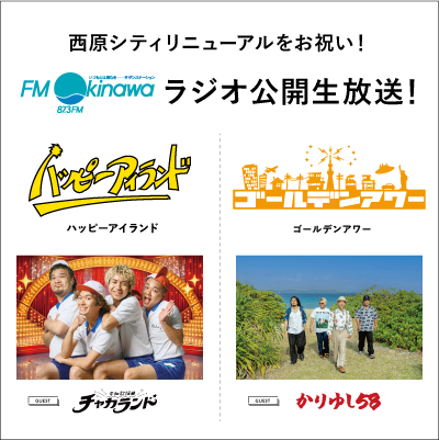 イベント情報 店舗ごとに絞り込んで表示できます すべて 石川シティ 宮古島シティ 那覇メインプレイス 具志川メインシティ 宜野湾コンベンションシティ 西原シティ 経塚シティ ハンビータウン 4/24(金)~26(日) 西原シティ巨大ガチャ✨ イベント実施店舗 西原シティ 4/29(水) FM沖縄 ラジオ公開生放送! イベント実施店舗 西原シティ 募集及び作品提出期間 4/29(水)まで 展示期間 5/2(土)~5/10(日) イベント実施店舗 那覇メインプレイス、西原シティ、具志川メインシティ、豊見城ウイングシティ、つかざんシティ、しおざきシティ、経塚シティ、宜野湾コンベンションシティ、宮古島シティ、石川シティ