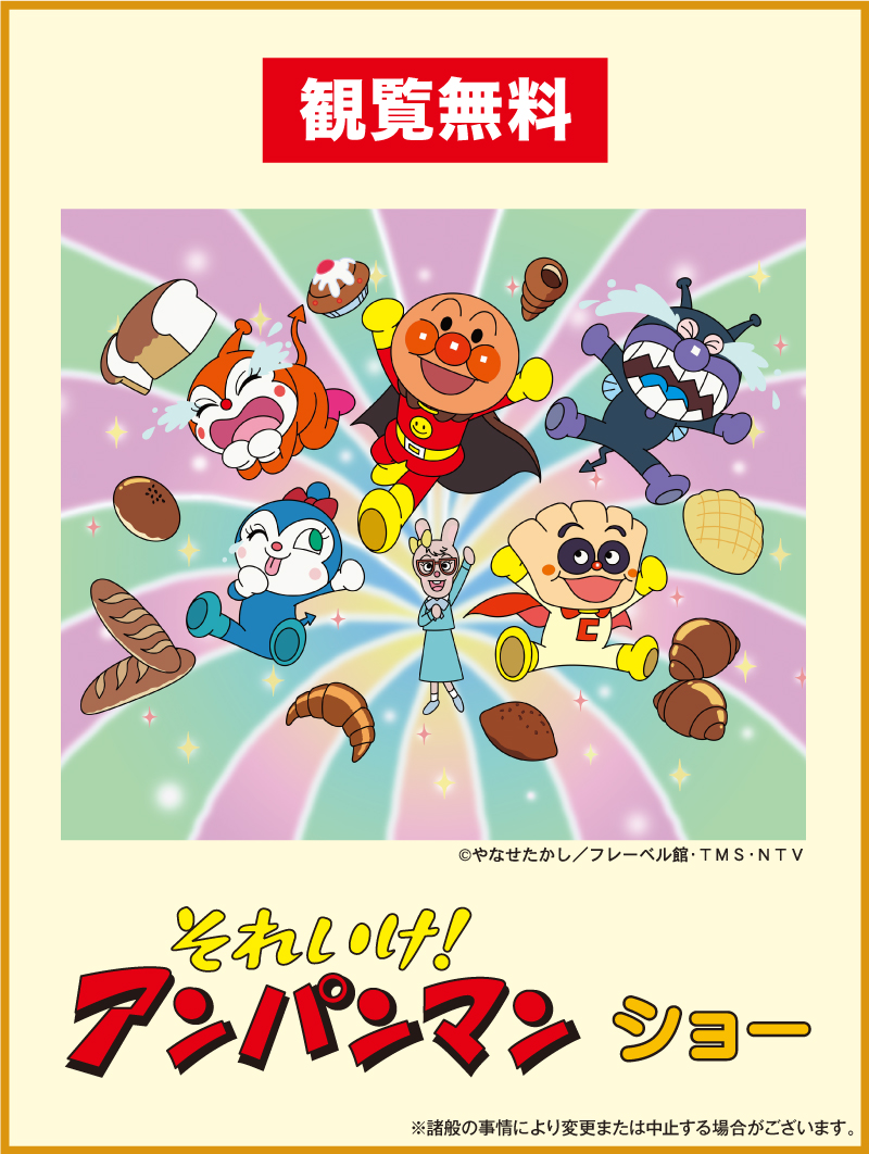 それいけ!アンパンマン ショー 開催日時開催店舗10/13(月) 11:00~パルコシティ (1Fマーケットプラザ)10/13(月) 13:30~宜野湾コンベンションシティ (2Fはごろもコート)10/13(月) 16:30~具志川メインシティ (1Fメインコート)