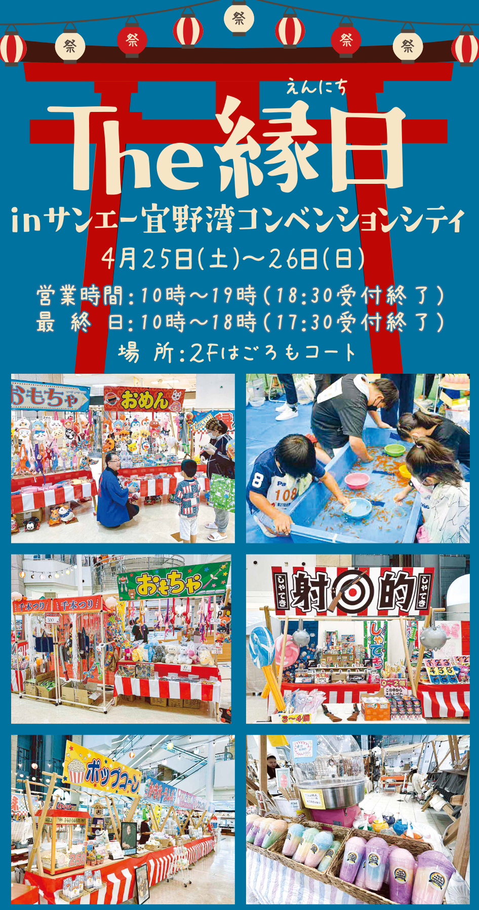 The縁日 ※一部内容が変更になる場合がございます。ご了承ください。 開催日時開催店舗4/25(土)・4/26(日) 10:00~19:00(18:30受付終了) ※最終日18:00(17:30受付終了)宜野湾コンベンションシティ (2Fはごろもコート)