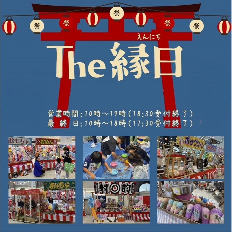 The縁日 開催日時開催店舗5/2(土)~5/6(水) 10:00~19:00(18:30受付終了) ※最終日18:00(17:30受付終了)那覇メインプレイス (1F中央コート)5/2(土)~5/6(水) 10:00~19:00(18:30受付終了) ※最終日18:00(17:30受付終了)西原シティ (1F食品館側コート)