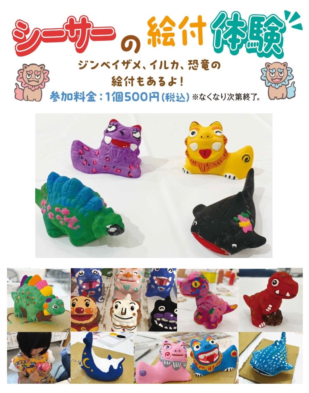 シーサーの絵付体験 開催日時開催店舗10/12(日)~10/13(月) 11:00~17:00受付までつかざんシティ (1Fつかざんコート)10/18(土)~10/19(日) 11:00~17:00受付までハンビータウン (1Fハンビーコート)