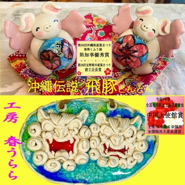 沖縄に古くから伝わる伝説を元に飛豚(とんとん):県知事賞他受賞、白寿面シーサー・琉球面シーサー:全国グローバル賞・那覇市長賞受賞。琉球ガラスを使いオリジナルペンダントを製作、販売しております。全て手作りの為、同じ物はあ りません。違いを楽しまれて下さい。