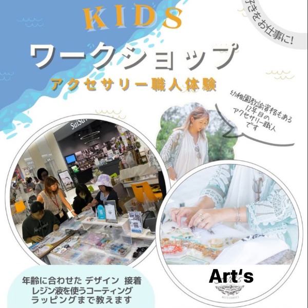 島のこどもたちにクリエイター体験ができるワークショップを開催します。作成から包装までレジンを使ってキーホルダーやヘアピンなどを作成します。ワークショップのほかArt‘sオリジナルアクセサリーも販売♡