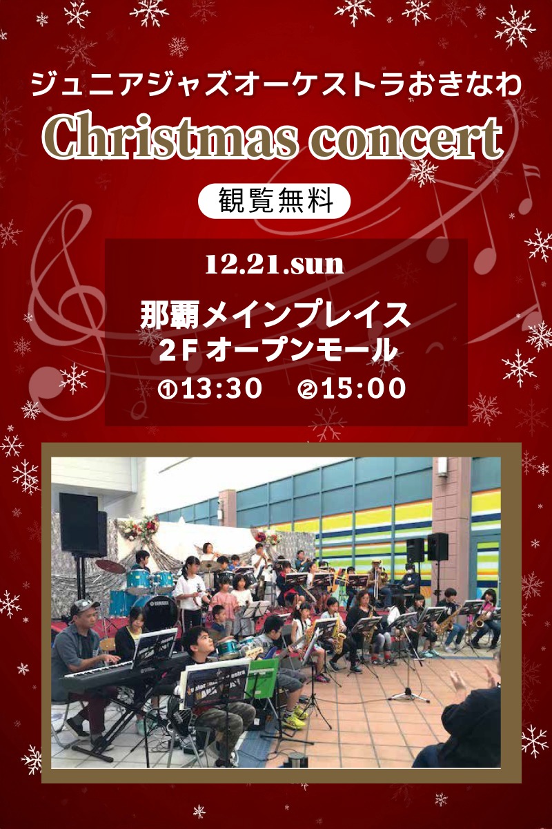 ジュニアジャズオーケストラおきなわ クリスマスコンサート °˖✧♪◝✧˖° 演奏曲 °˖✧◜♪✧˖°♪聖者の行進♪名探偵コナン♪じんじん♪安里屋ユンタ♪シング シング シング 開催日開催店舗開催時間12/21(日)那覇メインプレイス (2Fオープンモール)①13:30 ②15:00