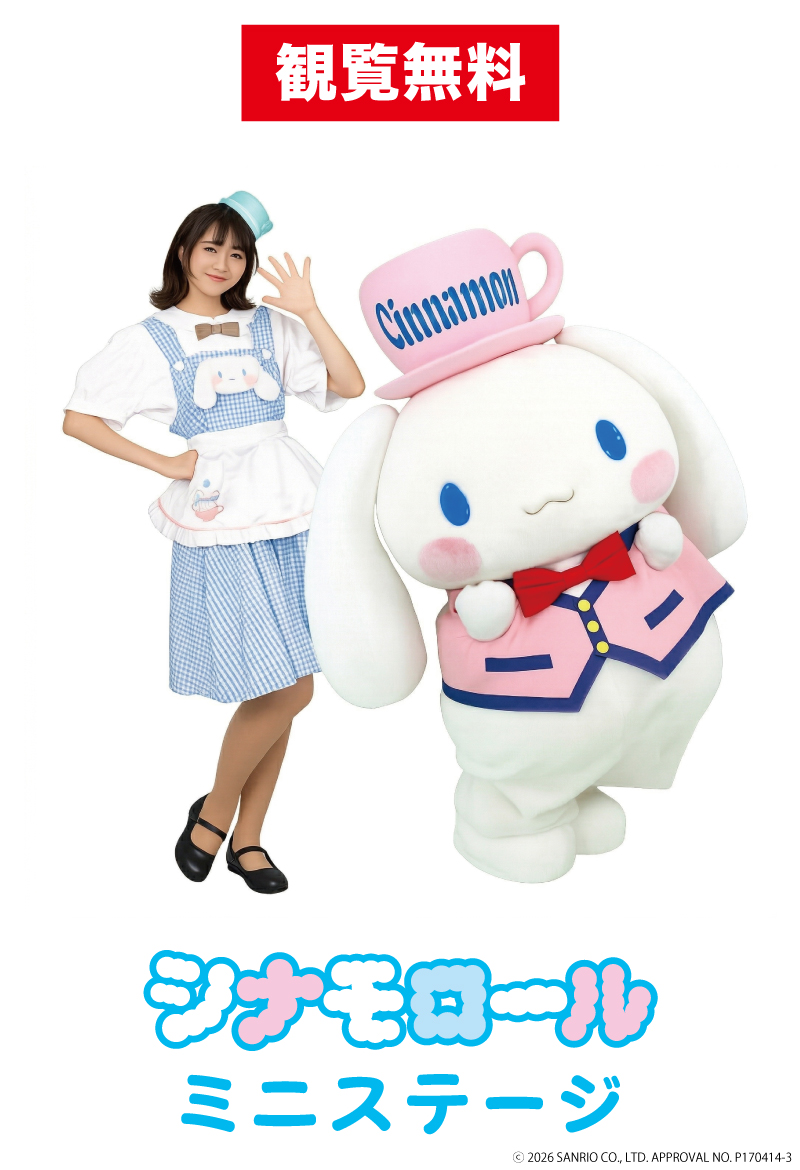 シナモロール ミニステージ 日時開催店舗5/5(火) 11:00パルコシティ (1Fマーケットプラザ) 5/5(火) 14:00西原シティ (1Fエディオン側コート)5/5(火) 17:00宜野湾コンベンションシティ (2Fはごろもコート)5/6(水) 11:00石川シティ (1F中央コート)5/6(水) 13:30具志川メインシティ (1Fメインコート)5/6(水) 17:00経塚シティ (1F中央コート)