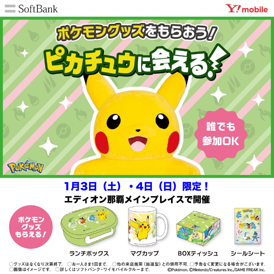 ポケモンイベント~ピカチュウ写真撮影会~ ポケモンイベント~ピカチュウ写真撮影会~ 日時:1/3(土)~4(日) 時間:10:00~18:00 【ピカチュウ登場時間】11:30~12:0013:00~13:3015:00~15:3016:00~16:3017:30~18:00 写真撮影会参加方法:各回30分前より整列開始 先着40組限定(会場にて整列いただいた順番に整理券をお配りします) 場所:エディオン那覇メインプレイス 主催:エディオン(ソフトバンク)