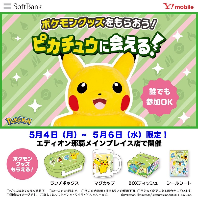 ポケモンイベント~ピカチュウ写真撮影会~ 那覇メインプレイスポケモンイベント~ピカチュウ写真撮影会~ 日時:5/4(月)~5/6(水)時間:10:00~18:00 【ピカチュウ登場時間】11:30~12:0013:00~13:3015:00~15:3016:00~16:3017:30~18:00 写真撮影会参加方法:各回30分前より整列開始 先着40組限定(会場にて整列いただいた順番に整理券をお配りします) 場所:エディオン那覇メインプレイス主催:エディオン(ソフトバンク)