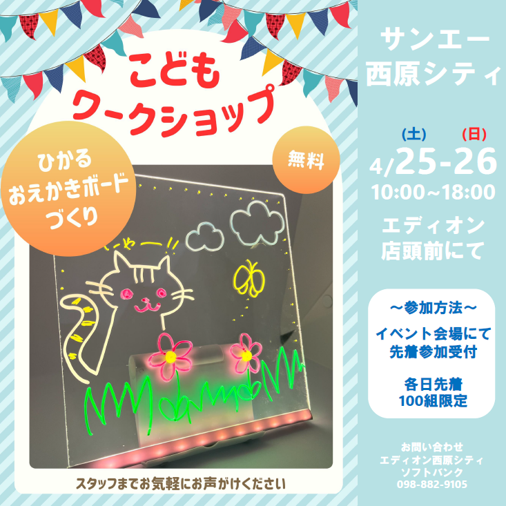リニューアルOPEN記念イベント~光るおえかきボードを作ろう!!~ 日時:4/25(土)~26(日)時間:10:00~18:00参加方法:イベント会場にて参加受付(各世帯1枚限り、各日先着100組限定)場所:エディオン西原シティ主催:エディオン(ソフトバンク)