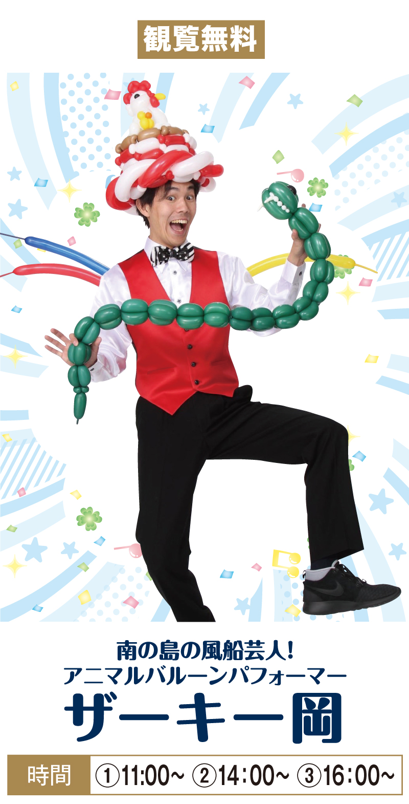 アニマルバルーンパフォーマー ザーキー岡 開催日時開催店舗5/4(月) ①11:00 ②14:00 ③16:00宮古島シティ (エレベーター前特設会場)5/5(火) ①11:00 ②14:00 ③16:00那覇メインプレイス (2Fオープンモール)