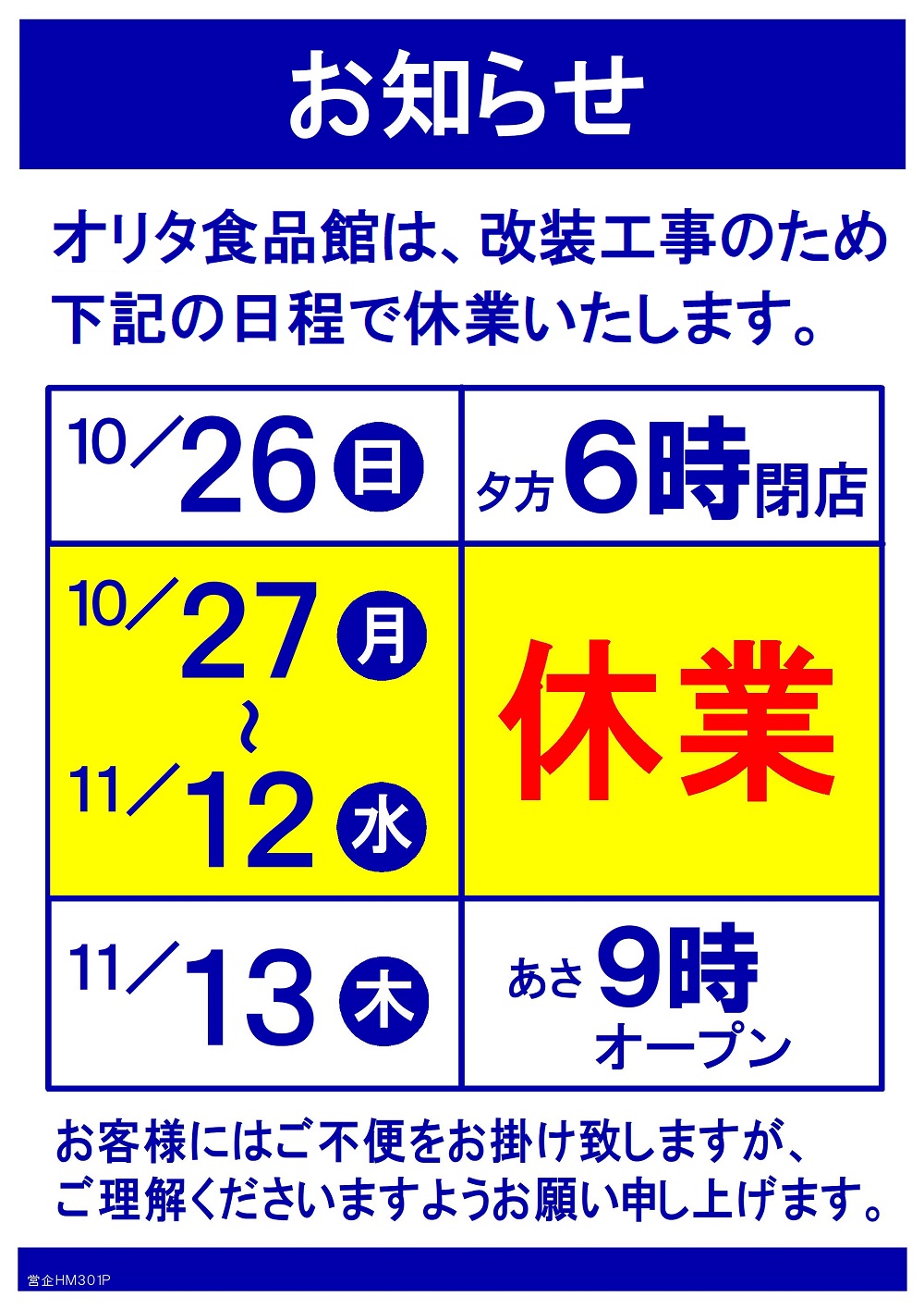 10/26夕方6時~11/12オリタ食品館 休業のお知らせ 宮古オリタ食品館は、改装工事のため以下の通り休業いたします。 ・10/26(日) 夕方6時閉店・10/27(月)~11/12(水) 休業・11/13(木) あさ9時オープン 期間中はオードブル・寿司・重箱等のご予約を承ることができません。お客様へは大変ご迷惑をおかけしますが、ご理解くださいますようお願いいたします。
