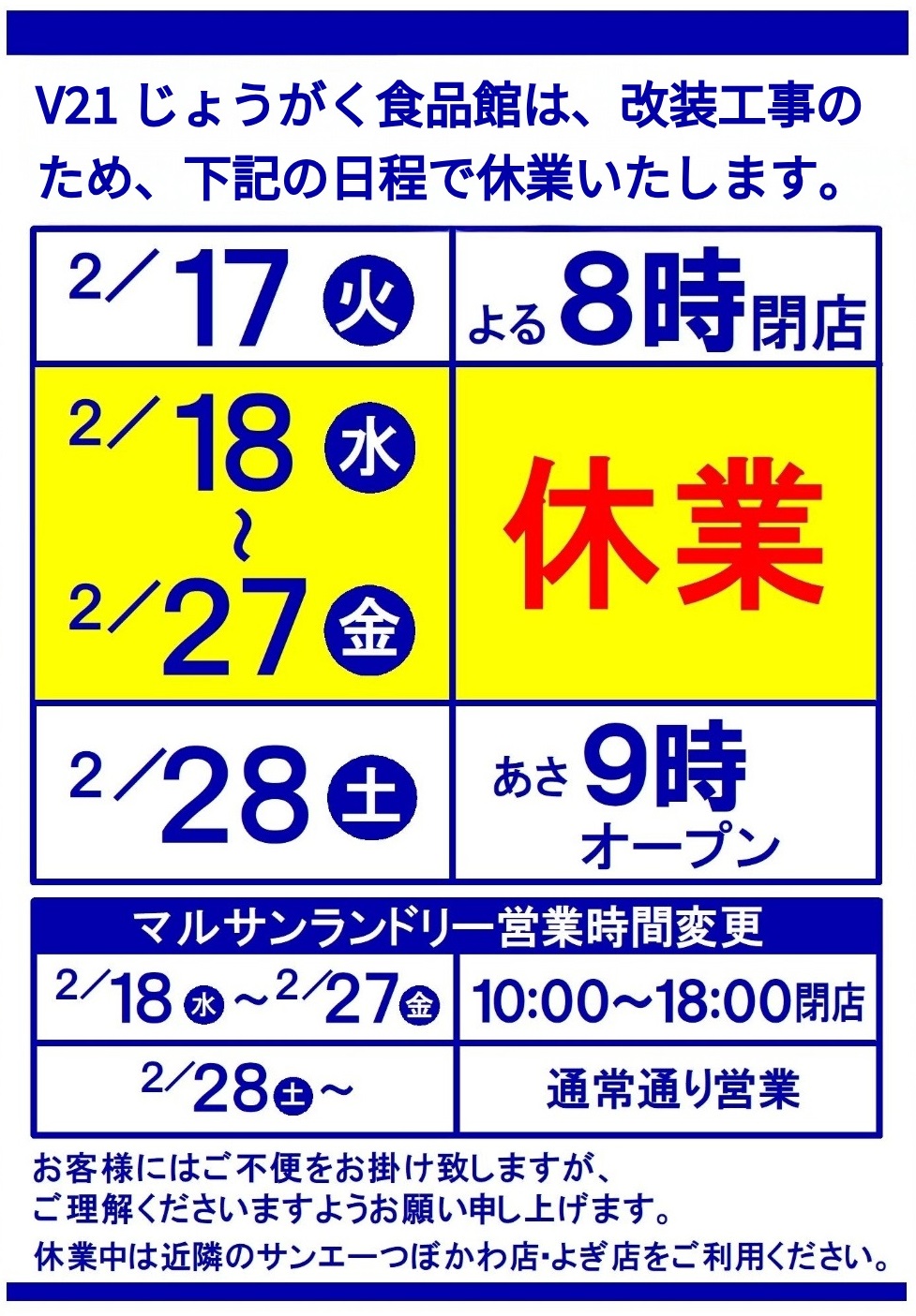 2/18~2/27 V21じょうがく食品館 休業のお知らせ