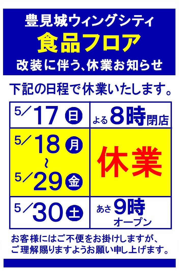豊見城ウィングシティ食品フロア 改装工事にともなう休業のお知らせ 豊見城ウィングシティ食品フロアは、改装工事のため以下の通り休業いたします。 ・5/17(日) よる8時閉店・5/18(月)~5/29(金) 休業・5/30(土) あさ9時オープン お客様へは大変ご迷惑をおかけしますが、ご理解くださいますようお願いいたします。