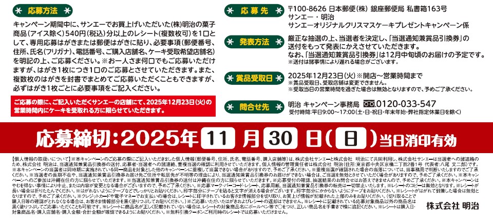 キャンペーン期間中に、サンエーでお買上げいただいた(株)明治の菓子商品(アイスを除く)540円(税込)分以上のレシート(複数枚可)を1口として、専用応募はがきまたは郵便はがきに貼り、必要事項(郵便番号、住所、氏名(フリガナ)、電話番号、ご購入店舗名、ケーキ受取希望店舗名)を明記の上、ご応募ください。※お一人さま何口でもご応募いただけますが、はがき1枚につき1口のご応募とさせていただきます。また、複数枚のはがきを封書でまとめてご応募いただくこともできますが、必ずはがき1枚ごとに必要事項をご記入ください。