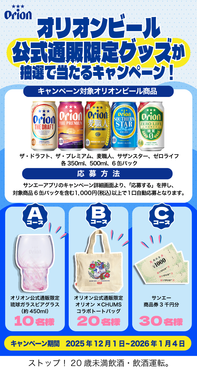 ・アルコール製品を含む応募につきましては、20歳以上の方に限定させていただくため、サンエーカード情報に生年月日の登録がない場合は、応募を無効とさせていただきます。