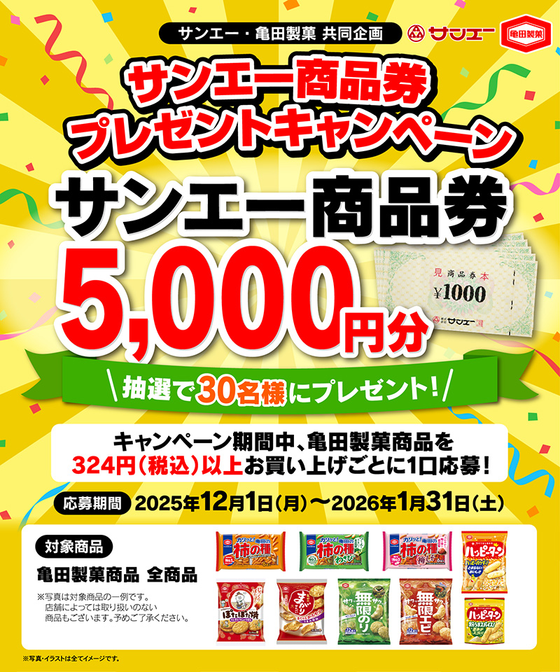 キャンペーン期間中、亀田製菓商品を324円(税込)以上ご購入ごとに、1口応募!