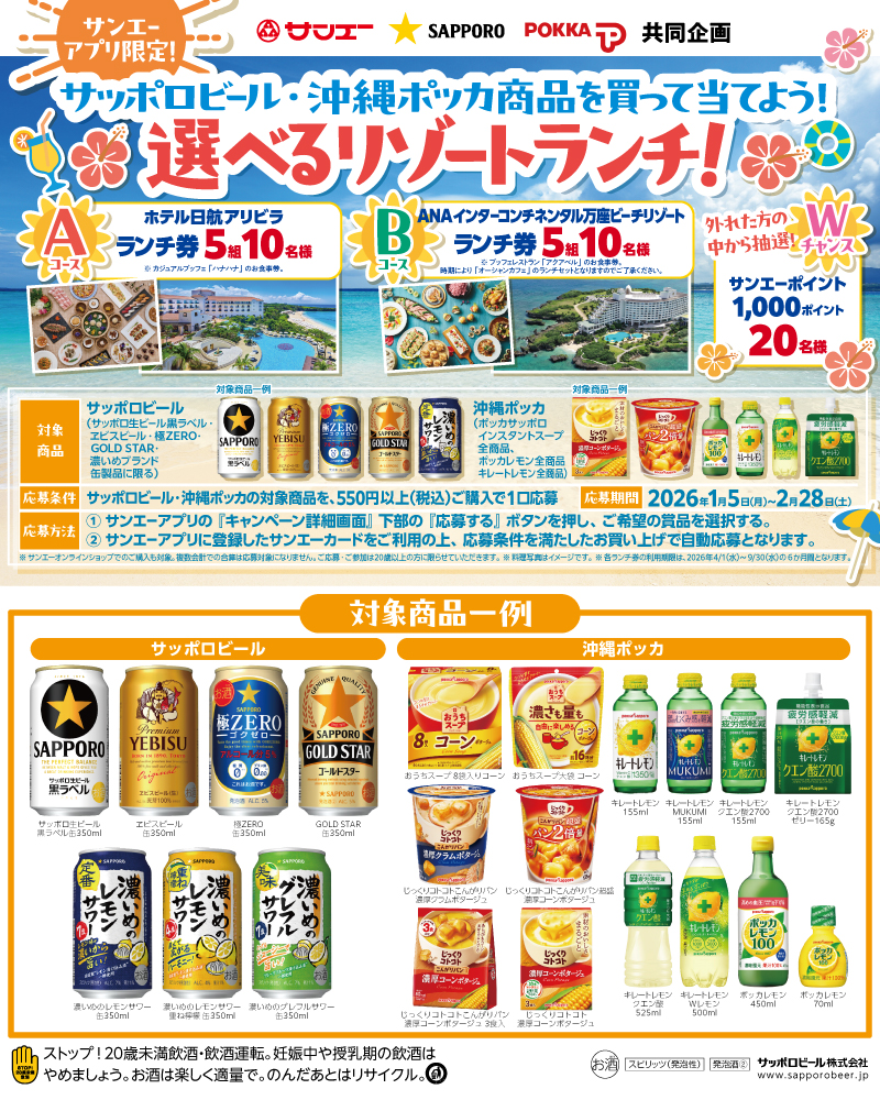 ■サンエーアプリで応募!サッポロビール・沖縄ポッカ商品を買って当てよう!選べるリゾートランチ!