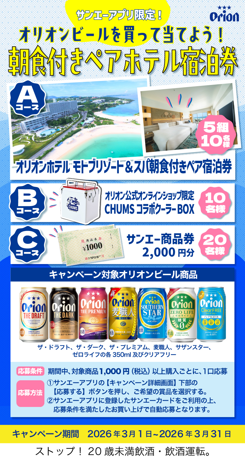 ・アルコール製品を含む応募につきましては、20歳以上の方に限定させていただくため、サンエーカード情報に生年月日の登録がない場合は、応募を無効とさせていただきます。
