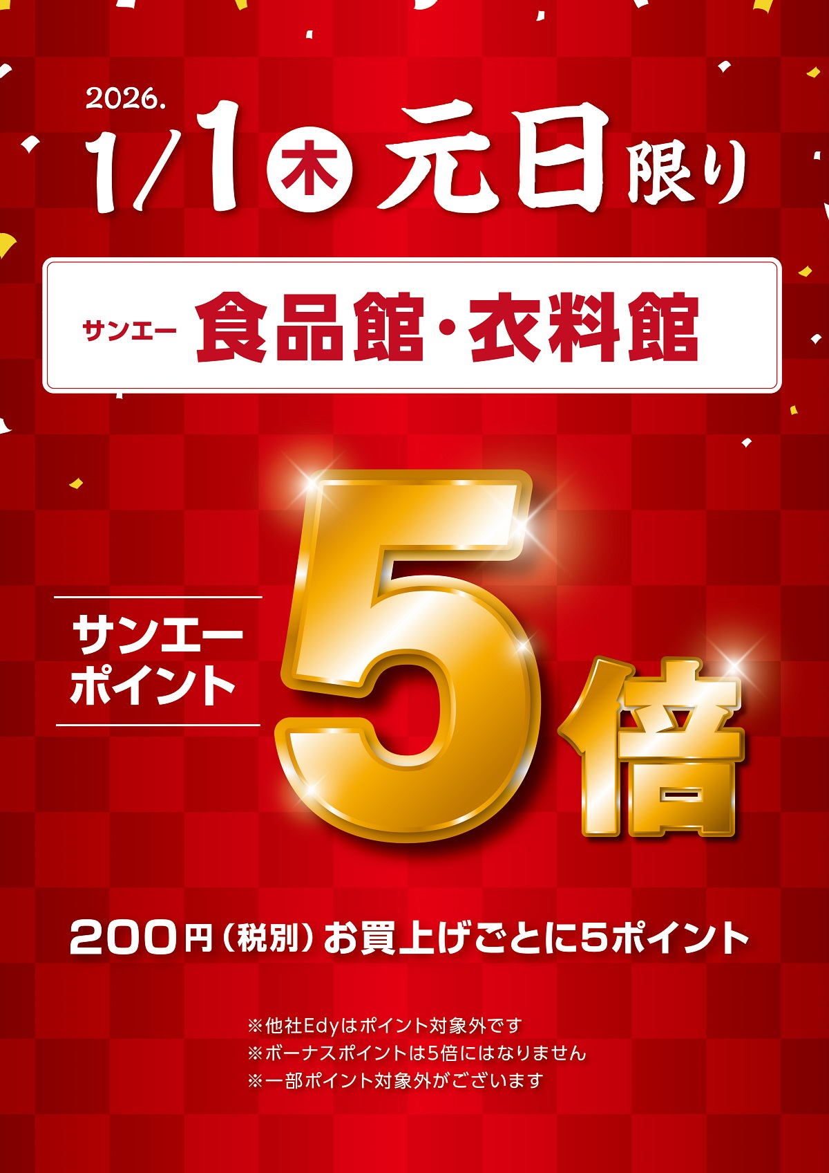 【予告】2026年元日限り サンエーポイント5倍! 他社Edyはポイント対象外です。 ボーナスポイントは5倍にはなりません。 一部ポイント対象外がございます。 サンエーポイント5倍対象店舗 サンエー食品館・サンエーネットスーパー・衣料館・ハンズ(ハンズビー)・無印良品(サンエー内に限ります)・エクセルワールド・チュチュアンナ・アカチャンホンポ・ラブトキシック・マーキーズ・プティマイン・F.O.Store・ホワイトクローゼット・フルーツギャザリング*沖縄県内のサンエー店舗のみ対象です。