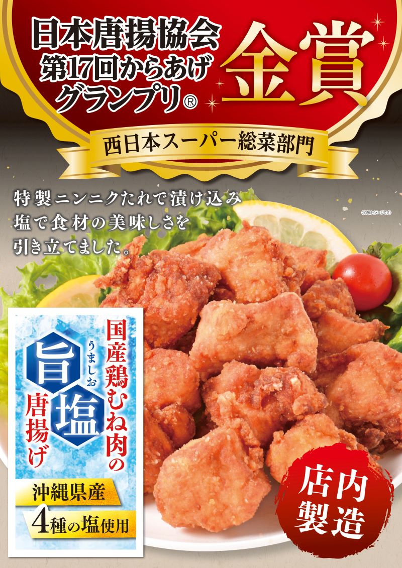 国産鶏むね肉の旨塩唐揚げ「金賞受賞」 \今年もやりました!/ 第17回 からあげグランプリ金賞受賞! 国産鶏むね肉使用「旨塩唐揚げ!」 特製ニンニクたれで漬け込み塩で食材の美味しさを引き立てたサンエーの金賞唐揚げ! 食品館 惣菜コーナーにて販売中!ぜひご賞味ください! ※写真はイメージです※各日売切れ次第終了となります。予めご了承ください。 おすすめリンク 食品館店舗一覧はこちらから