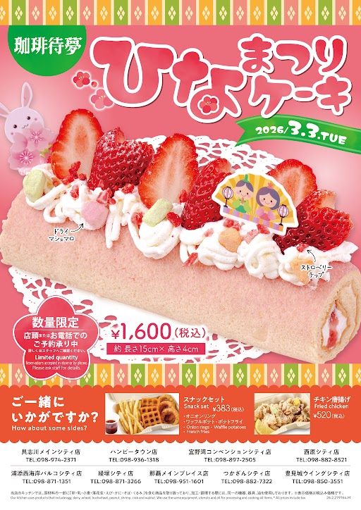 【珈琲待夢】ひなまつりケーキご予約承ります ご予約は珈琲待夢店頭またはお電話にて承ります ご予約承りは、3/2(月)まで 店舗一覧 ※各店数量に達し次第終了いたします。※詳細は各店舗へお問合せください。 おすすめリンク 珈琲待夢店舗情報