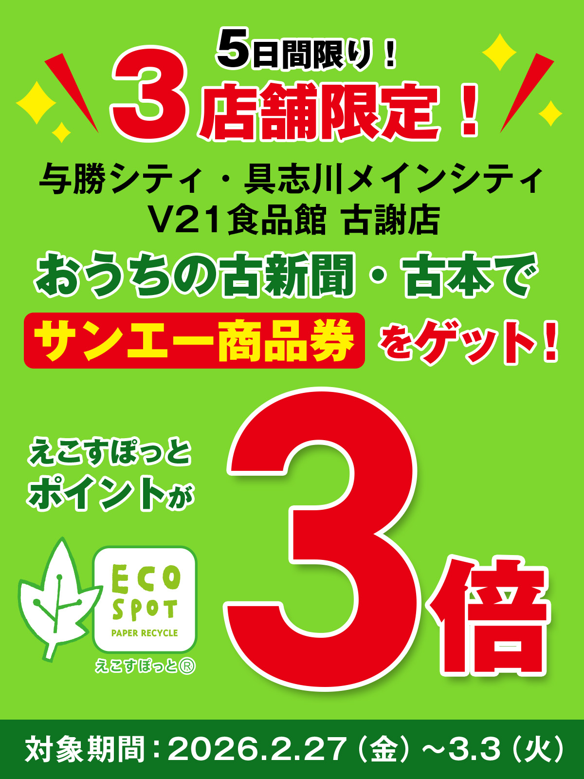 3店舗限定!えこすぽっとポイント3倍 3店舗限定!えこすぽっとポイント3倍 期間 2/27(金)~3/3(火)あさ9時~よる7時まで 対象店舗 ・具志川メインシティ・V21古謝店・与勝シティ えこすぽっと詳しくはこちら▶