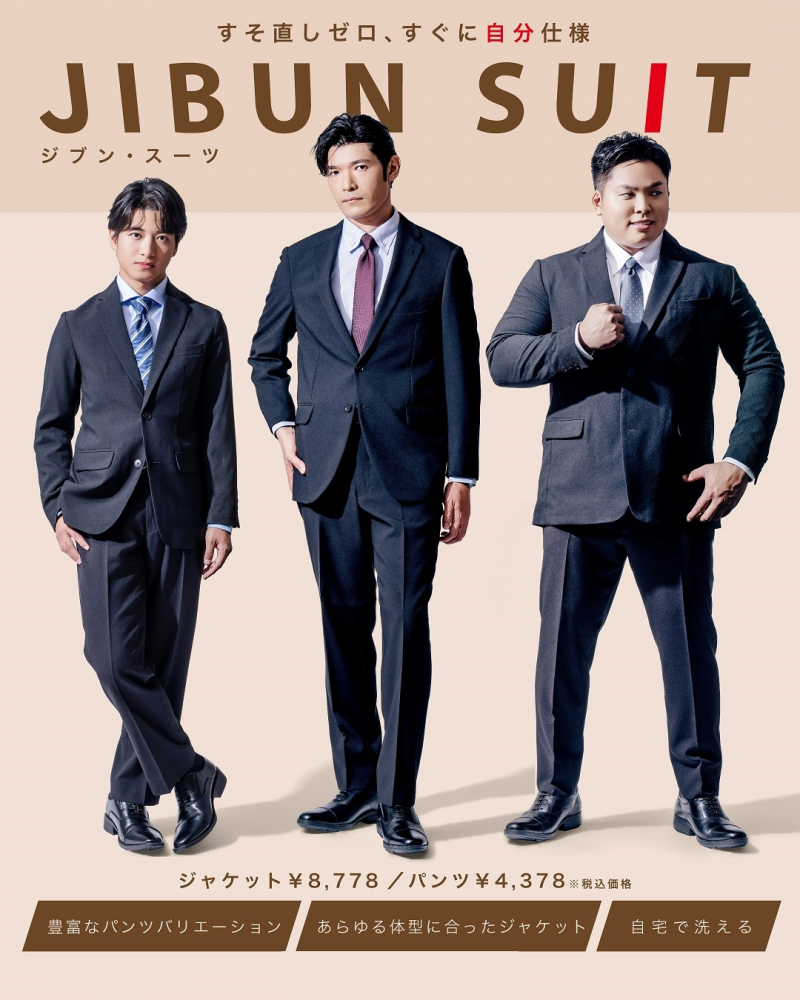 JIBUN SUIT(ジブン・スーツ) 豊富なパンツバリエーション! あらゆる体型に合ったジャケット! 自宅で洗える! CM放映!JIBUN SUIT (ジブン・スーツ) ▽ファーストスーツ特集はこちら はじめてのスーツ、失敗はしたくない。挑戦するあなたを支える!サンエーのファーストスーツ。詳細は画像をチェック👇 〇掲載商品は一例です。〇店舗により取扱商品が異なります。〇好評につき売り切れの際はご容赦ください。
