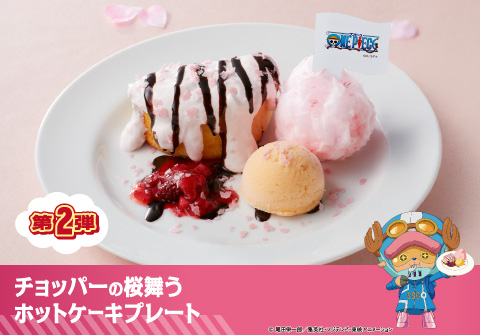 チョッパーの大好きなわたあめを桜に見立てたパンケーキプレート。ピンク色のクレープ生地を全体にかけ、舞い散る桜の花びらを表現しています。チョッパーのあの有名なシーンを思い出させるようなパンケーキをお楽しみください。