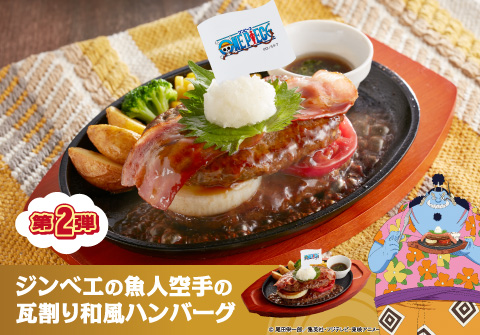 魚人空手の達人ジンベエの技名に「瓦」がある事にちなんで、ハンバーグで瓦割りを表現しました。和のイメージもあることから、ハンバーグにはてりやきソースをかけ、添えたわさびドレッシングでピリッとした風味ある味わいも楽しめます。