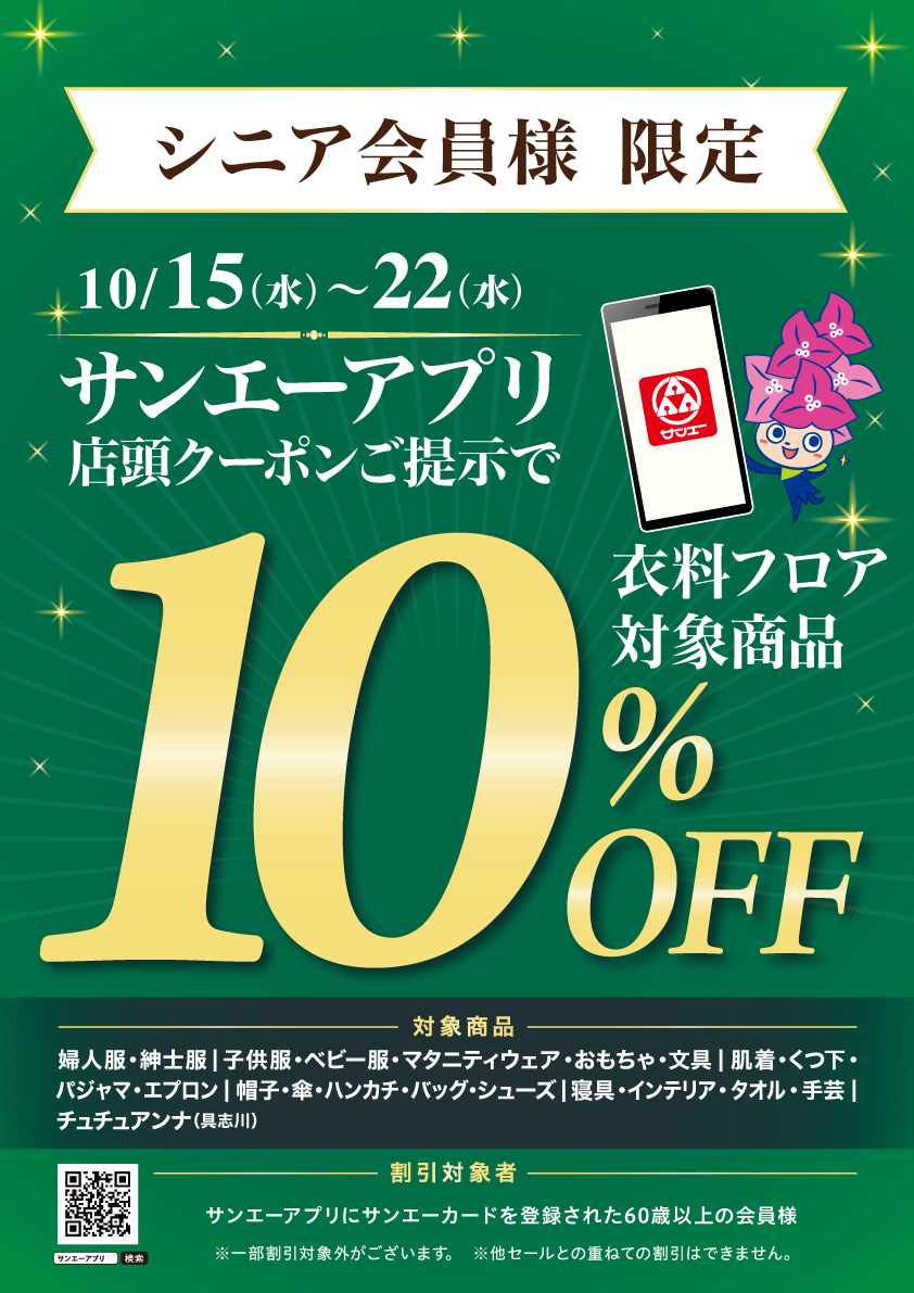 ■【予告】アプリシニア会員様|衣料品10%OFF